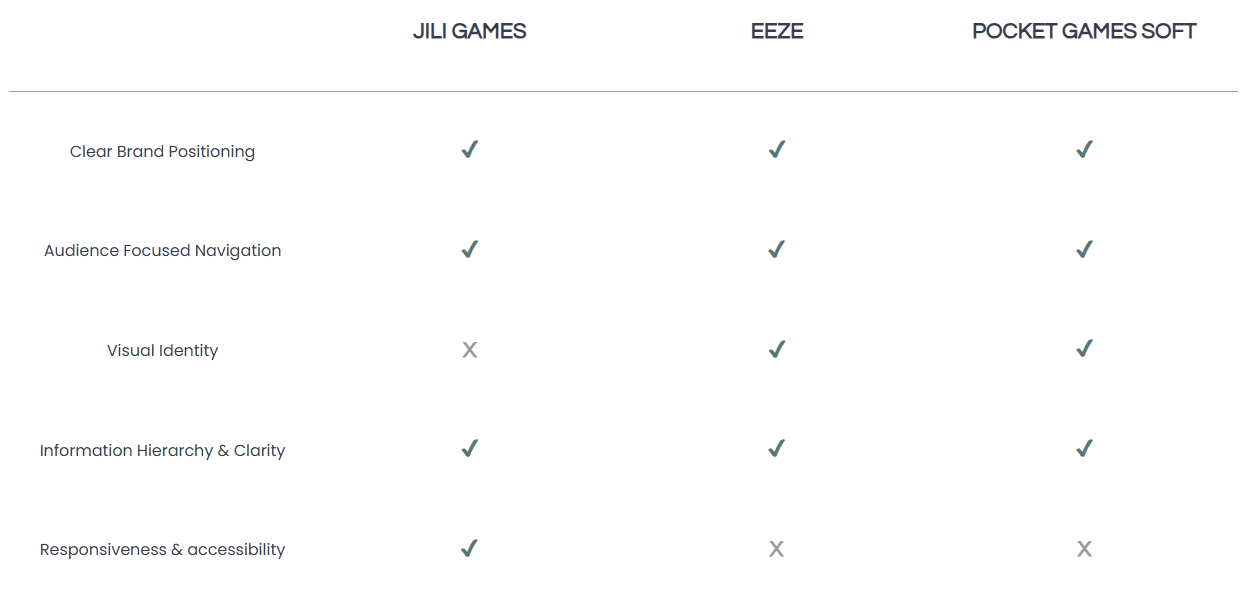 To position HyberGaming as a recognizable and trustworthy game studio, I conducted a competitive analysis of leading studio and publisher websites, including